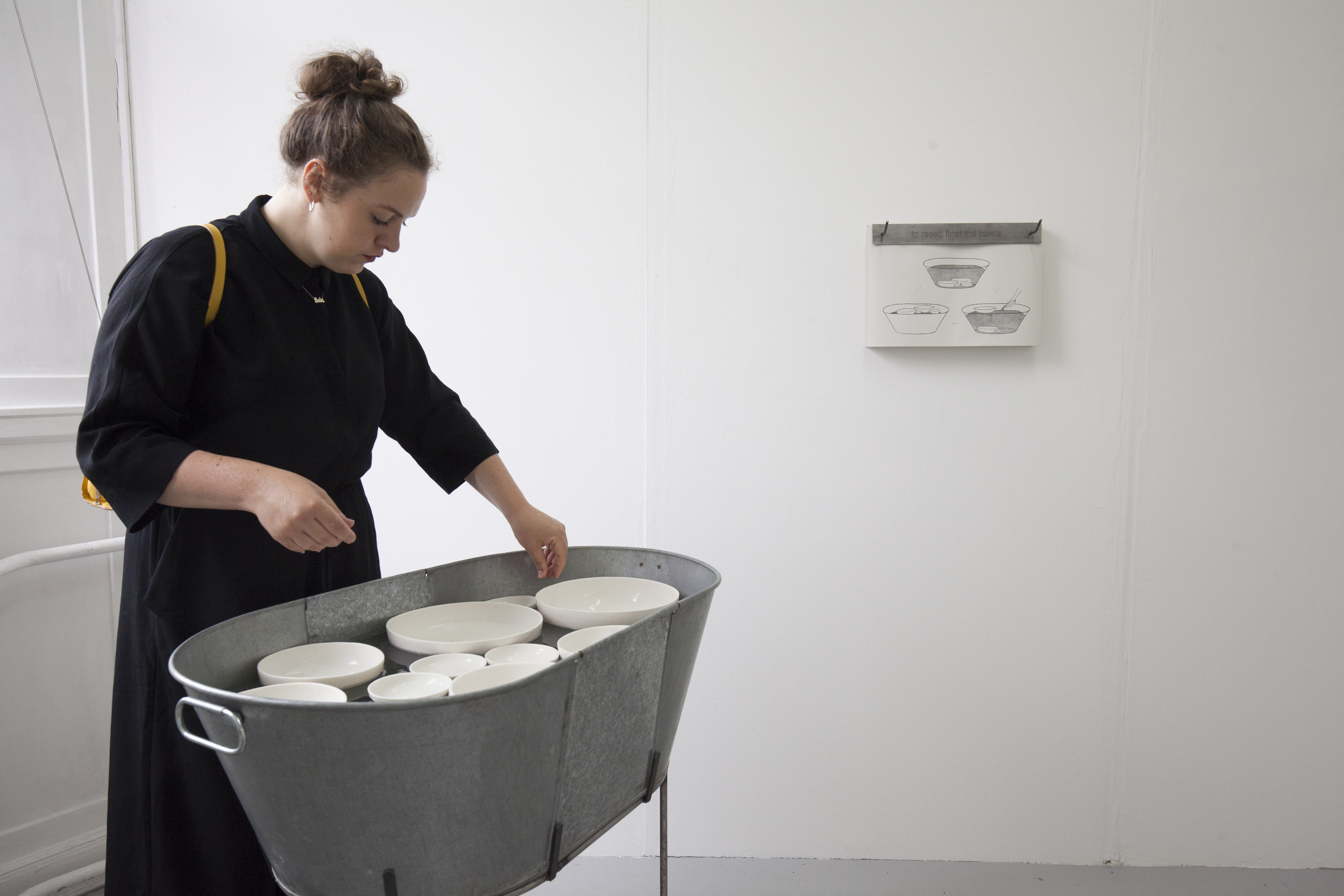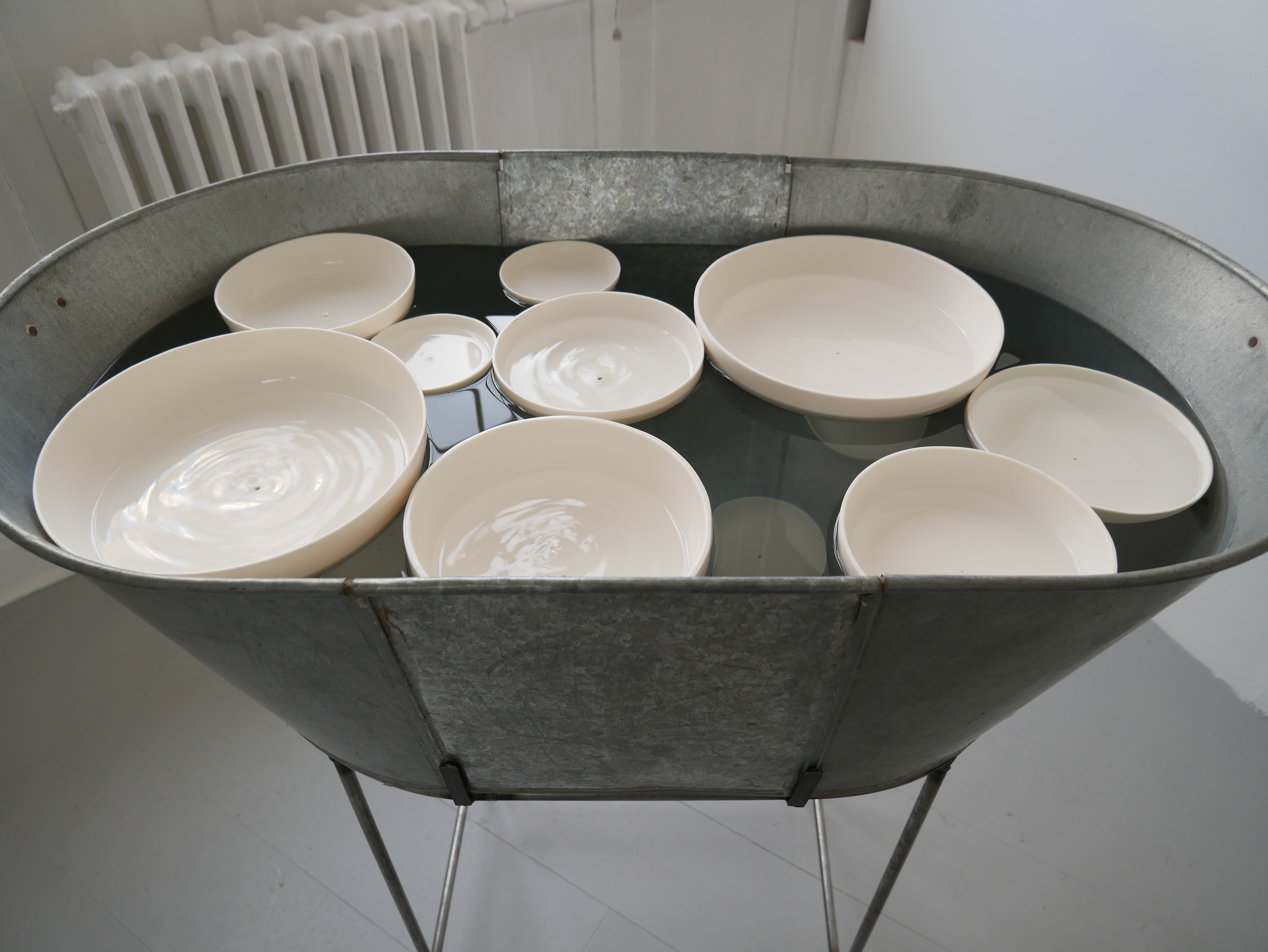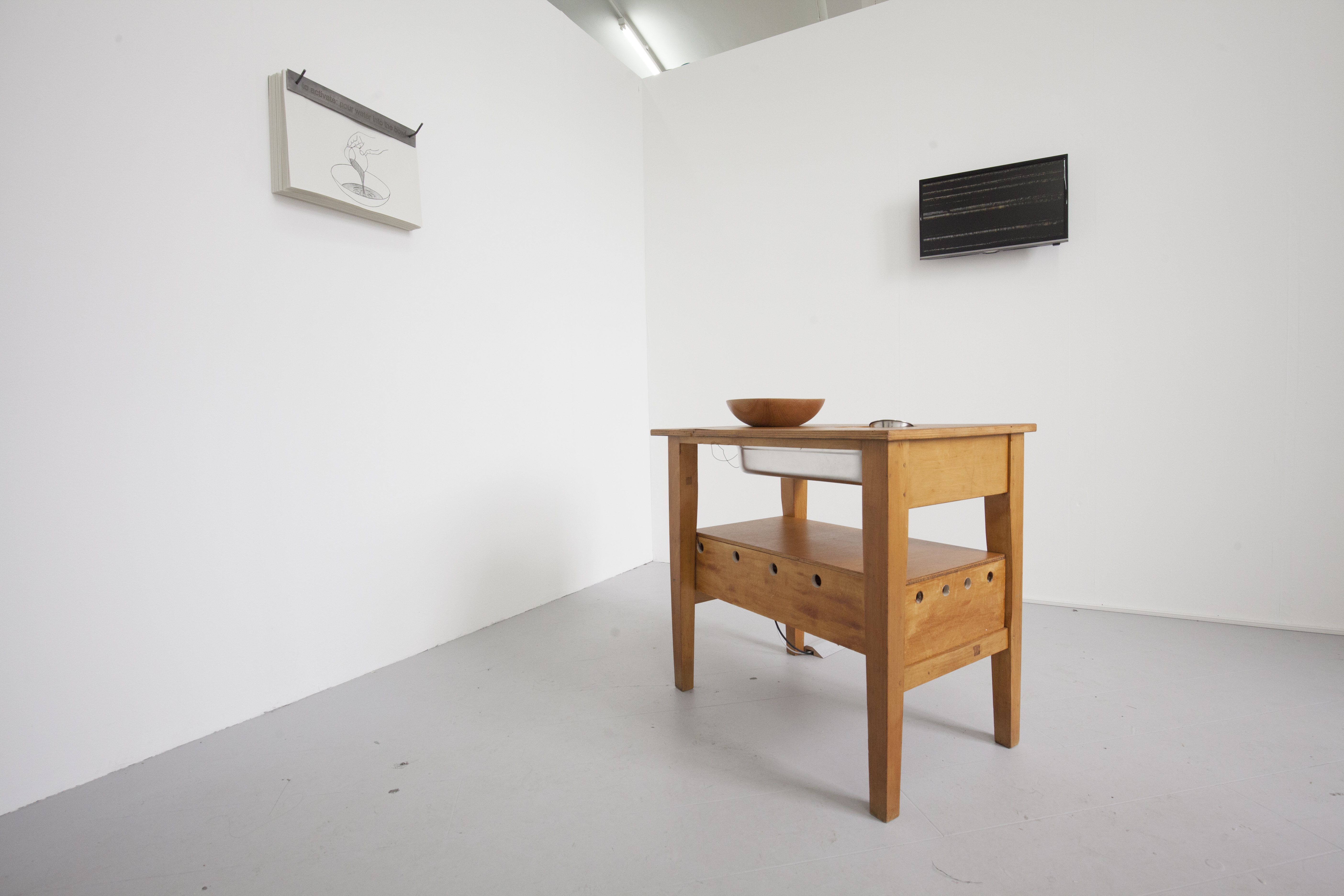 Clepsydra is a participatory installation in two parts: Generator and Clepsydra. Generator consists of an altered wooden desk, an integrated steel basin, a steel cup, a wooden bowl and a 22″ screen. When a participant pours water into the bowl, it runs through a hole in the bottom and activates a film of cogs turning on the monitor. The film plays for the length of time the water takes to run through the bowl. Clepsydra is a steel bath and stand which is filled with water. In / on the water are ceramic bowls with holes in the bottom. Participants place the bowls on the surface of the water, where they gradually fill up and ultimately sink.