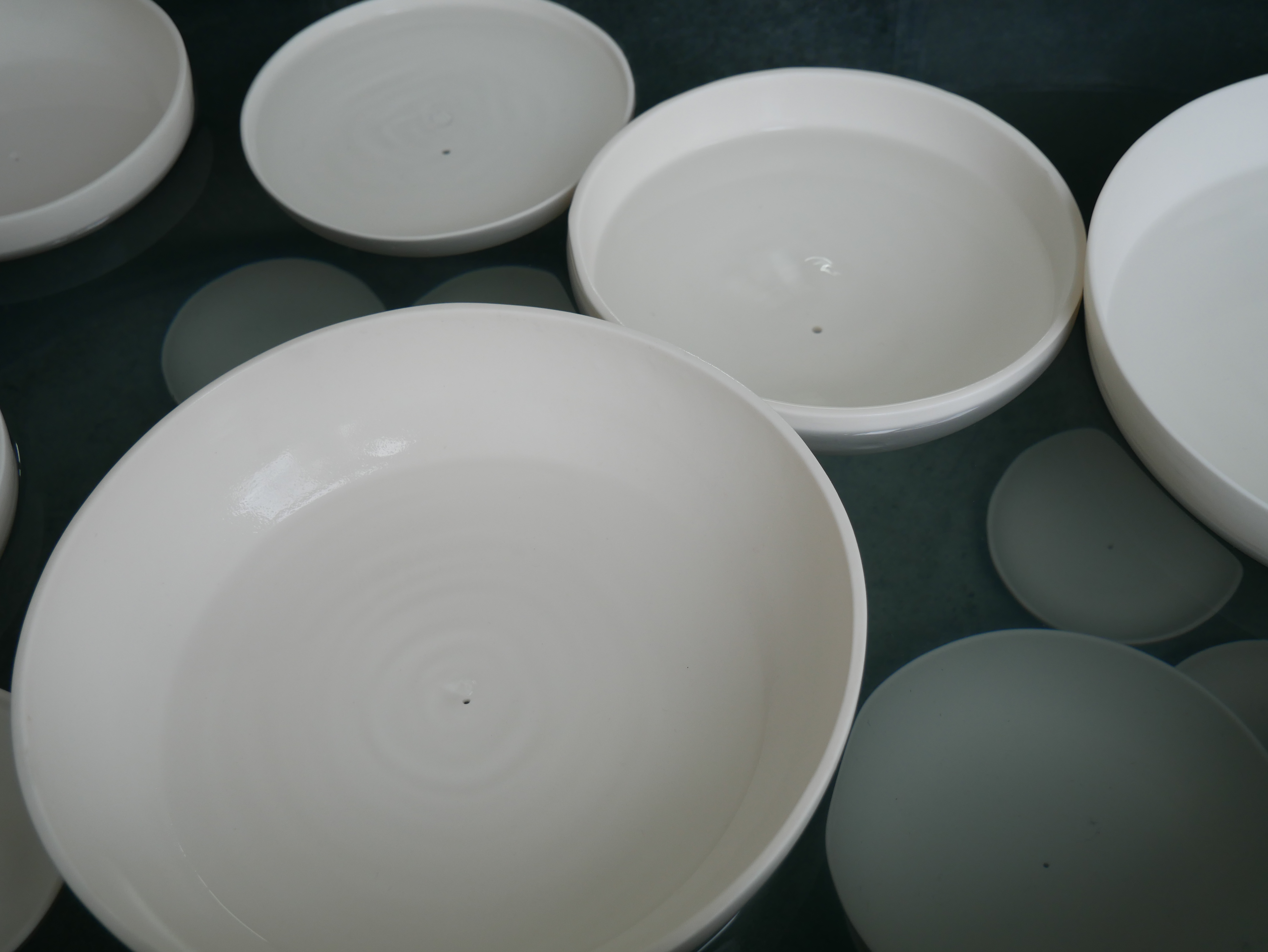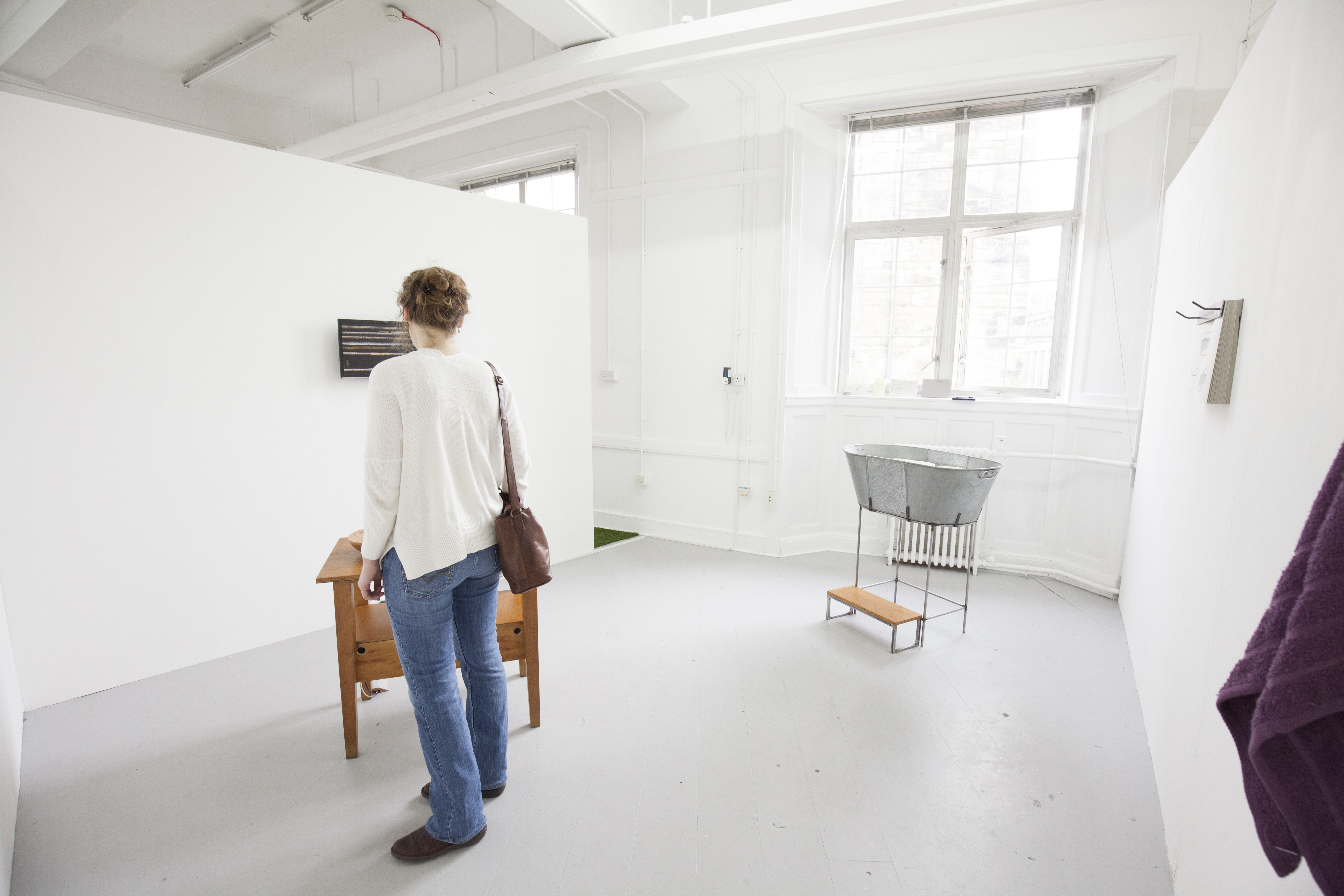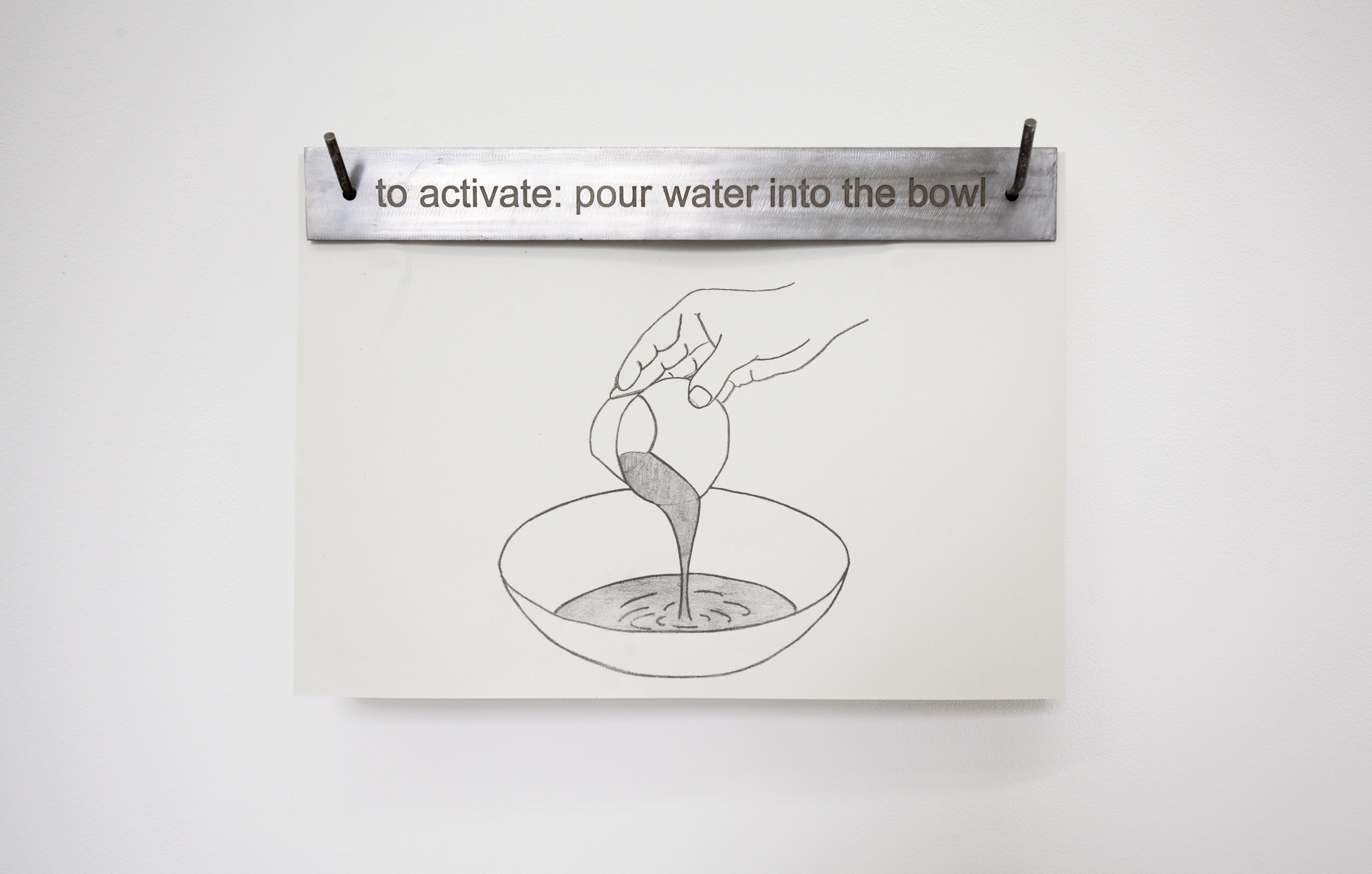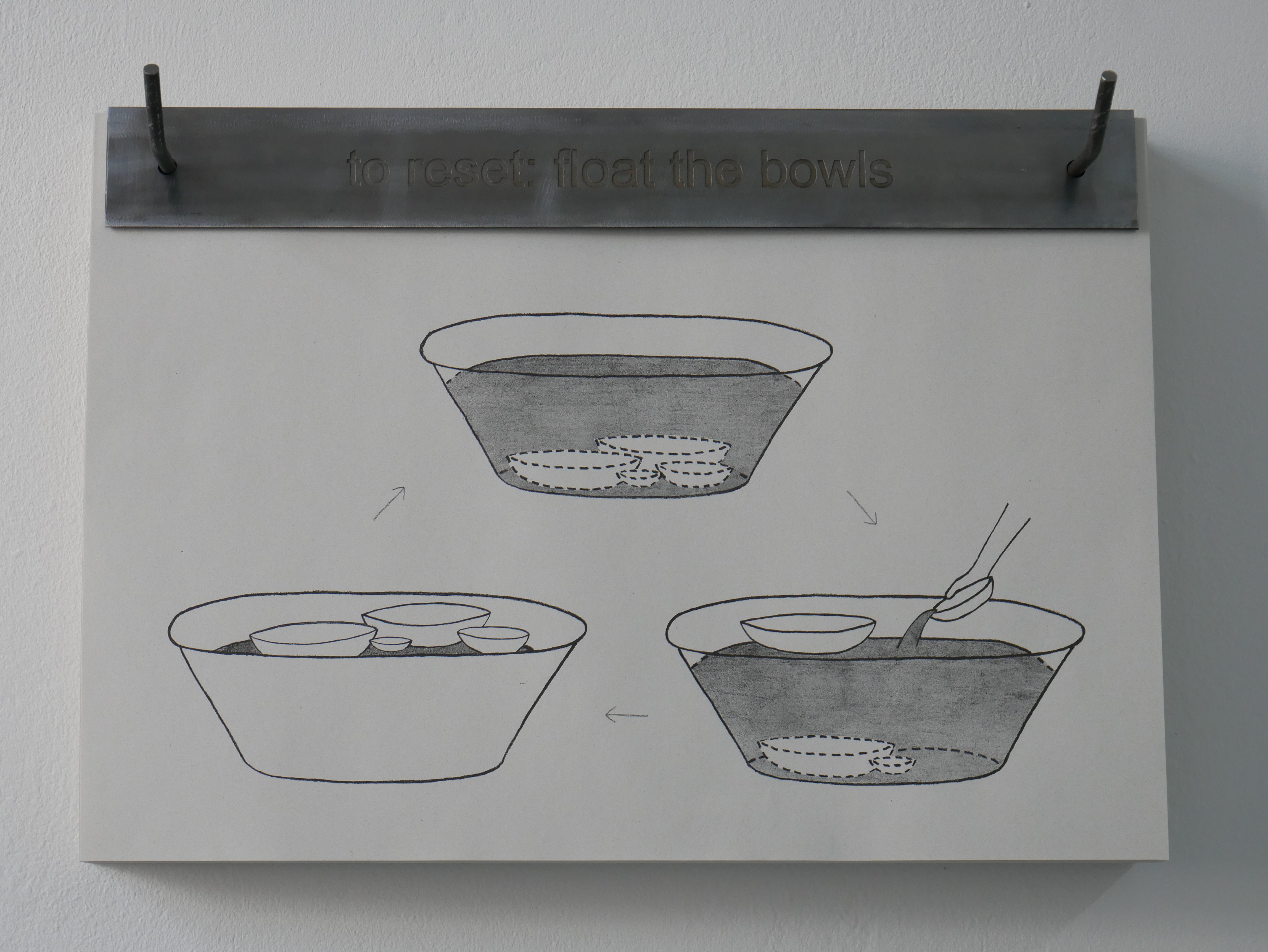 Clepsydra is a participatory installation in two parts: Generator and Clepsydra. Generator consists of an altered wooden desk, an integrated steel basin, a steel cup, a wooden bowl and a 22″ screen. When a participant pours water into the bowl, it runs through a hole in the bottom and activates a film of cogs turning on the monitor. The film plays for the length of time the water takes to run through the bowl. Clepsydra is a steel bath and stand which is filled with water. In / on the water are ceramic bowls with holes in the bottom. Participants place the bowls on the surface of the water, where they gradually fill up and ultimately sink.