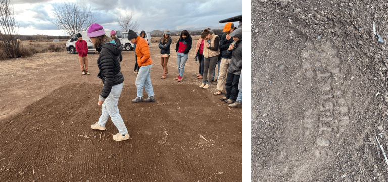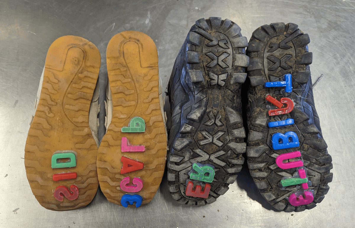 2023. Borderlands Restoration Network. Shoes, plastic letters, hot glue, soil, movement. Dimensions variable.