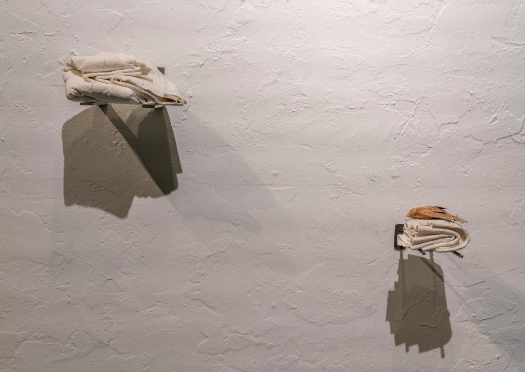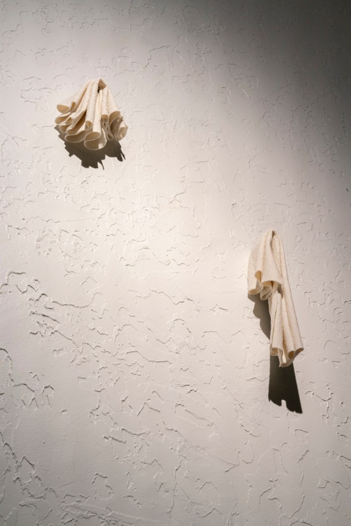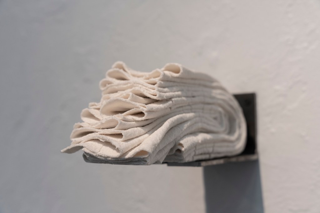 All works are slip-dipped porcelain – felt fabric, dipped in porcelain slip, when fired the felt combusts and the porcelain retains its shape and texture.