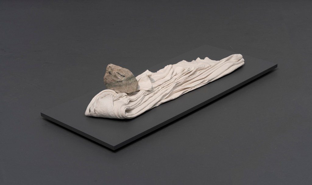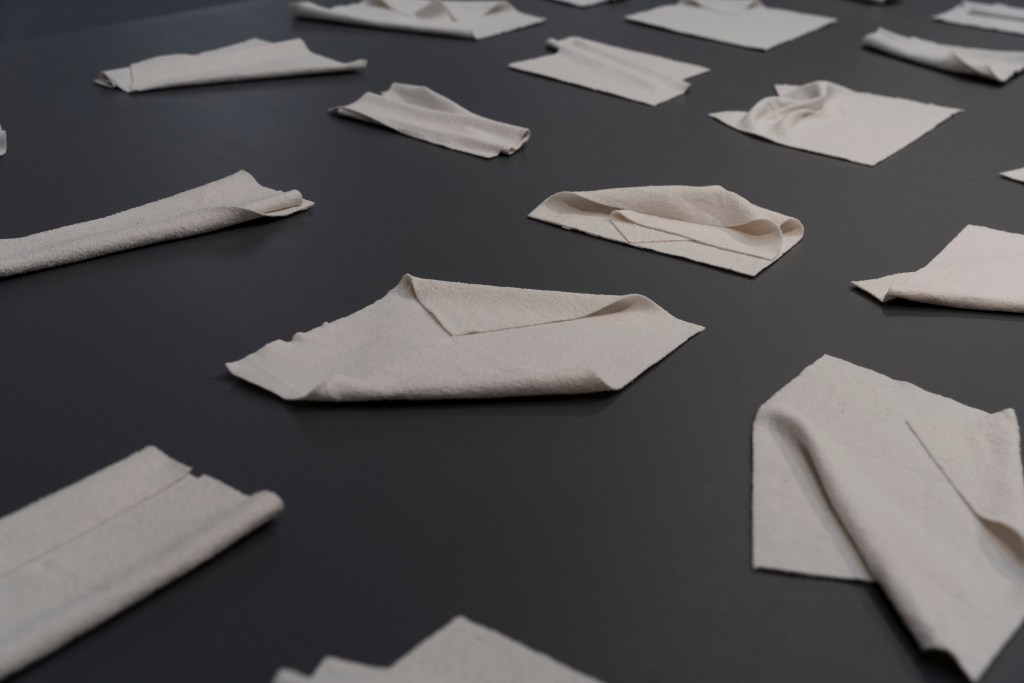 A grid of “letters” lie on the floor – perhaps a new alphabet, or correspondence written in a language of folds. Lengths of felt fabric are folded into themselves, creating closeness from distance. Felt is a noun and a verb. Felt is not felt but porcelain. A translation. A mistranslation. Rocks compress, hold and divide, create pressure, security, tension, precarity, connection and space.